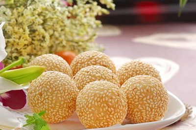糯米淘洗干净浸泡后,加水磨成米浆装入布口袋吊起,待水分滤干后放置4-5小时,让吊浆面自然发酵至略有酸味后,加碱、糖揉匀搓成长条,下每个约重15克的剂子35个,搓成圆球形后,粘上芝麻入温油锅中炸,边炸边用平漏勺背反复踏压炸至泡空起来,壳呈金黄色即可。