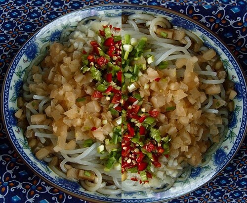 2.加入酱油、味精、油辣椒、花椒面、麻油、醋、葱花、姜末、折二根拌均即可食用