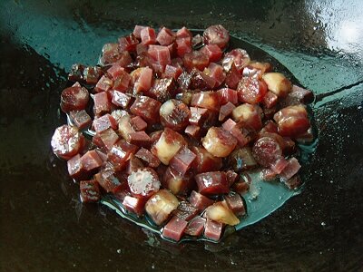 安顺豌豆腊肠洋芋糯米饭制作方法: