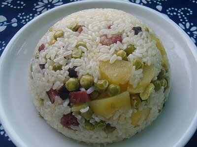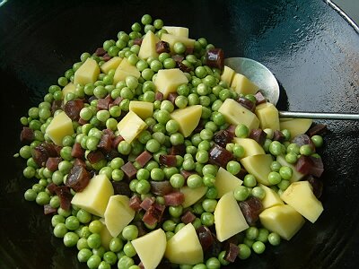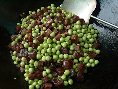 安顺豌豆腊肠洋芋糯米饭用料:糯米1000克,瘦腊肉150克,广式香肠150克,鲜豌豆400克,土豆300克,花生油50克,精盐15克。
