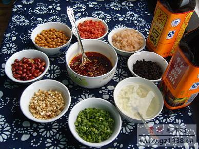 6。调料准备;花生用油炸脆,黄豆水泡5小时后用油炸酥,绿豆芽用开水烫一下捞出,黑大头菜、酸萝卜、盐菜要成碎丁,大蒜切碎后加少许凉开水制成蒜水,姜切姜末、葱切成葱花。
