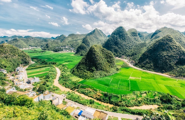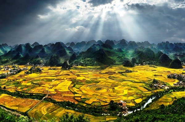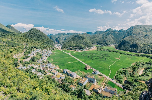 在景区入口乘坐景区观光电瓶车,沿着山间蜿蜒的电瓶车道前行,右手边既是由峰林和田地、村庄组成的绝美自然风光。眼前的田地五颜六色,最令人叫绝的是“八卦田”。其实这是一个碟形的地陷漏斗,由地下河局部坍塌和地表水溶蚀而成,聪明的布依人因地制宜,围着漏斗造出了一圈圈的田地,从高处望下去,仿佛一个五彩的八卦,很是壮观。