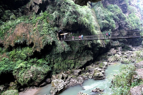 进入景区大门,乘坐观光电梯下到谷底,沿着河谷两边的步道前行,路边的指示牌清晰的标明各景点的所在位置。河上有两座大桥:江心铁索桥、海狮桥,将江两边的游览步道连为一个环状。沿着这个环形一圈游览下来约2-3小时。基本可以将峡谷内景点一网打尽。