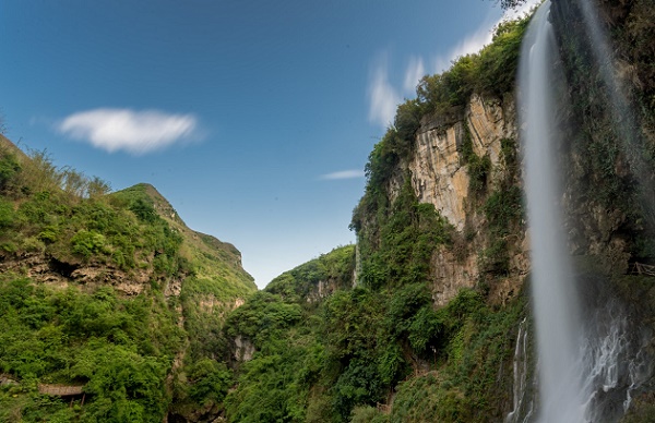 峡谷两壁孕育出规模宏大、错落有致的钙化岩,构成了特有的岩石瀑布;70多公里长的峡谷中有大小瀑布百余条,如万马咆哮,如银河缺口,奔腾而下颇为壮观;很多瀑布下都掩藏着不为人知的水帘洞,也是马岭河峡谷的奇观之一。