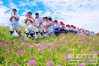 韭菜花开的季节(每年8月初至10月中旬),登上大韭菜坪峰顶,头顶蓝天,放眼望去,起伏的山丘上数万亩野韭菜花竞相开放,漫山遍野的紫色球状韭菜花,点缀在万亩绿色草叶之间, 灿烂,辽远,让人心旷神怡。畅游花间,野韭菜花的芳香扑面而来,令游人留连忘返,陶醉其间。