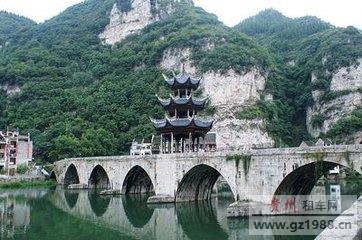 为七孔青石拱桥。桥中央有一个三层三檐八角攒尖顶楼阁建筑,被称为"状元楼"、"魁星阁"。据说此楼建成十年后,贵州果然破天荒地出了两个状元。