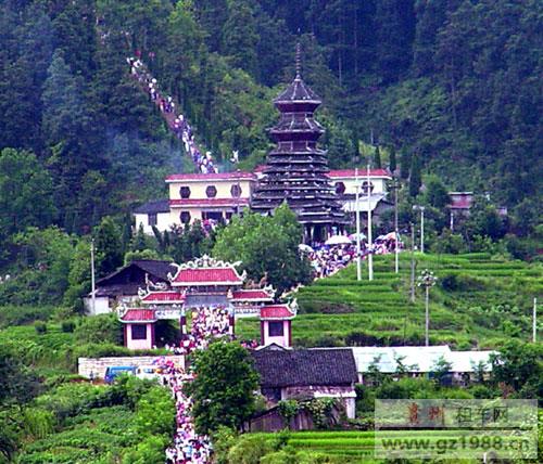 黎平南泉山寺在黎平县城南1.5公里南泉山中。《黎平府志》载:“南泉叠嶂丛林,明建三寺于山,游人络绎不绝,为最名胜。南泉山行道,皆以鹅卵石铺就,纵横曲折,从山脚逶迤而上。山腰行道旁有一平地,竖碑一方,上刻”南泉福地“,顺道直至大佛殿,殿前侧面有一八角亭,亭外有四方水池三眼,一供饮用,二备盥洗。泉水清澈,四季长流。