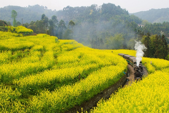 嘉阳小火车,一辆运行在四川南部犍为县城北15千米远的一条只有19.84千米的窄轨铁路上的“老爷火车”。这辆蒸汽火车的轨道距离仅762毫米,比国家标准列车的轨距少了近一半,铁路全线仅19284米,往返一次需2个小时。 2018年初,芭石铁路(嘉阳小火车)入选中国工业遗产保护名录(第一批) 。芭石铁路主要有跃进站、蜜蜂岩、老鹰嘴、菜子坝、亮水沱、黄村站等景点。