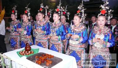 贵州少数民族在长期的社交活动中,形成了独特的民族礼俗,表现了他们热情好客、团结和睦、理智文明的美德。 苗族是一个十分好客的民族。有稀客、贵客来到苗寨,往往是主人家请客喝酒吃饭以后,主人家的兄弟、房族、友邻甚至全寨的人家都会接着来请,真可谓"一家客人全寨亲"。苗家请客大都有鸡、鸭、鱼、肉和木耳、香菇、豆腐、豆芽,以及富有民族特色的腌鱼、盐酸菜、香肠、血豆腐等菜肴。不仅要敬酒劝酒,还要唱古歌、飞歌助兴。