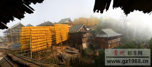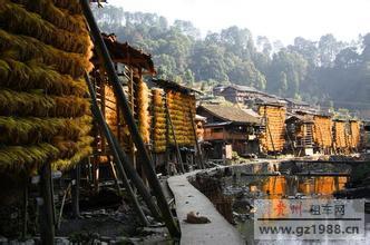 每年这个时候,金灿灿的稻穗挂满寨头林间,构成一幅幅丰收的田园画卷。形状象汉族地区的牌坊,顶部两边盖上一尺宽的人字形杉木皮档雨。
